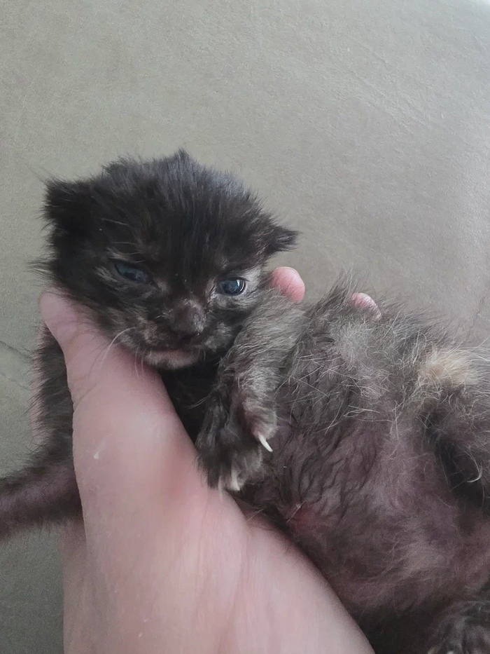 Было суетно, но весело, но спустя неделю погиб первый котёнок. Это было ожидаемо - он так и не начал есть сам, полностью отсутствовал сосательный рефлекс, весил всего 70 грамм на третий день и почти не набирал вес, это было грустно, но ожидаемо. К вечеру того же дня у второго обнаружили опухоль на лапке. Он был вполне бодр, хоть и худоват, мы ломанулись в ветеринарку, там ничего особо не сказали - слишком мал, даже не поставить капельницу, не взять анализы, не говоря же об операции. Только ждать, но сказали, шансов у него немного, слабый, мелкий. Хотя ел он сам, был бодреньким. Но в ту же ночь спустя час после кормления обнаружили, что он всё. Осталась у нас одна кошечка, но она была самая крупная, бодрая и активная, начала глазки открывать чуть ли не на второй же день, сама активно ползала, с аппетитом ела, прибавляла вес, в общем, мы были уверены, что она будет жить за них всех. Назвали её Кабан - за упитанность, напористость и волю к жизни.