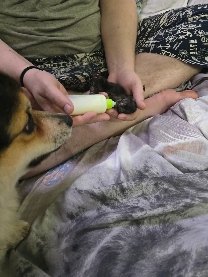 Мы были совсем недалеко, но я долго торговалась с собой - зачем мне такой гемор, да они наверняка уже погибли или их забрали, а ноги сами несли. Нашла тот пакет, стала разворачивать - боже, они все погибли, но писк один, второй, третий, живы! четвертый не дождался... Прибежала домой с охапкой котят, они были ледяные, мокрые, была уверена, что и ночь не проживут. Паника, чё делать то с ними, спасибо @IrinaKosh, котоматерь с опытом, научила как выхаживать. Стали с мужем мамками-кошками - кормление каждые 3 часа, массаж пуза и жопы, уиии, мы пописали, мы покакали, мы поели, собака сразу вписалась, нализывала их как родных (они даже к ней к сиськам умудрялись присасываться). Сгребла с озона всё, что только могло пригодиться - грелки, подогреватель бутылок, конечно же смесь, бутылки/шприцы/соски, только многосисечный агрегат не нашла с норм сроком доставки.