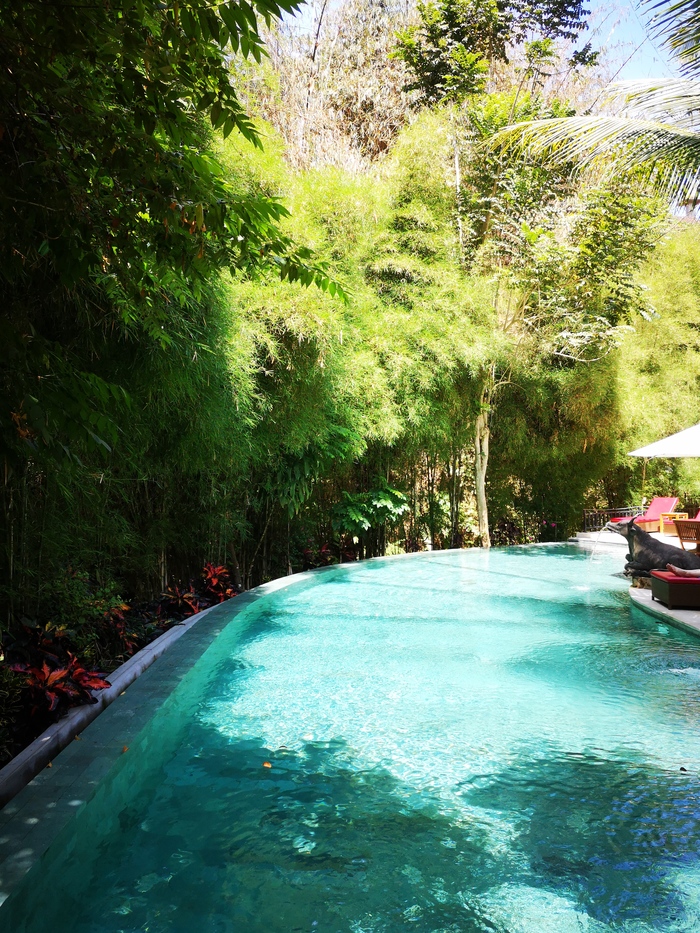 Второй отель в Убуде у нас был отличный. Запихнули часть джунглей в центр Убуда. Он стоит на перепаде высот, у небольшой речки снизу. Утопает в зелени, очень красивый бассейн. Приятно купаться и батониться на лежаках, в тени, в самую жару. Иногда пролетают цветные попугаи и бегают бурундуки по деревьям. А ночью даже обезьяна насрала нам на балкон. Природа! Единственный минус - петухи начинают орать в 4 утра и на весь день. И их очень даже слышно.