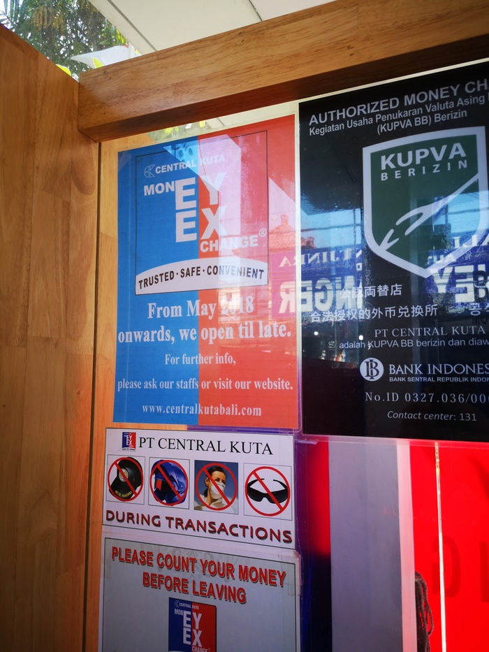 Выселелись из отеля в 12. Заселение на легиан в 2. В это время запланировали обменять денег и купить симку. Первый совет - Бали тренирует что то эзотерическое и кармическое. Увидели что то стоящее - покупайте и берите сразу. Дальше этого не будет. Нет смысла прицениваться и искать дешевле. Все дальше только дороже и хуже. Деньги - меняйте в официальных обменниках. Курс 14000 рупий за доллар или 14025 при бумажках в 50 и 100 баксов. Купюры 2006 года ещё принимают, все что меньше т. Е. 2005 и ранее нет. Доллары 1996 года не примут. 2006 еще примут.