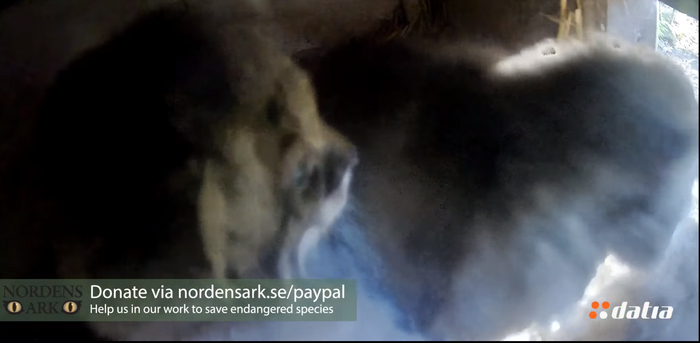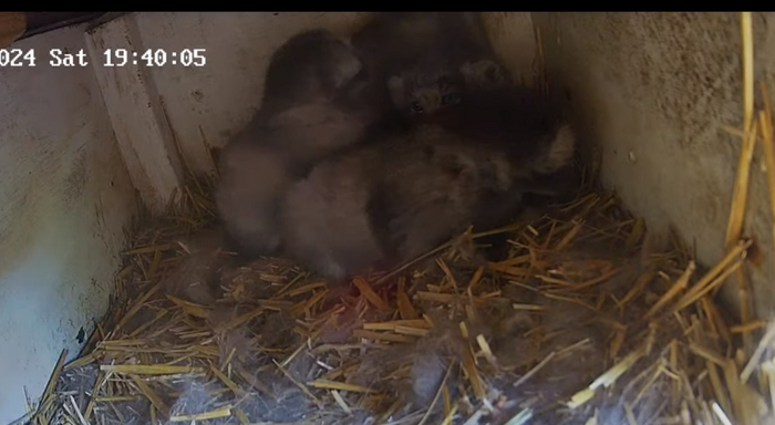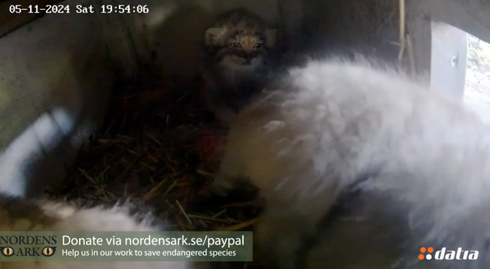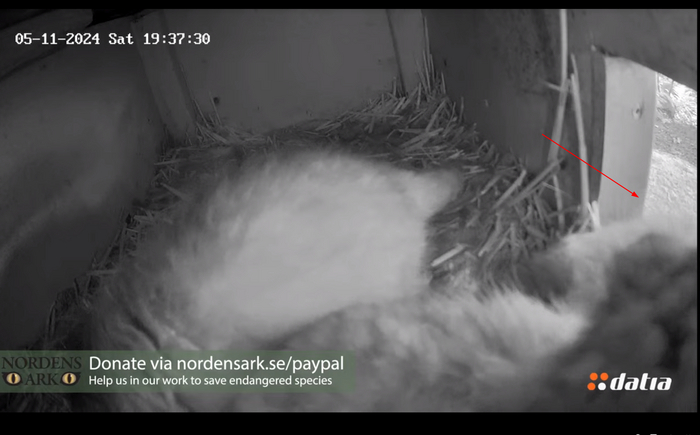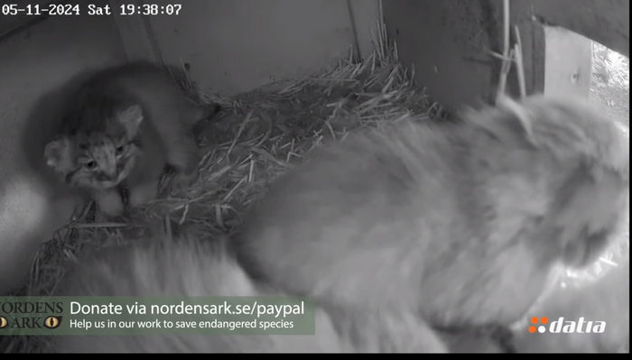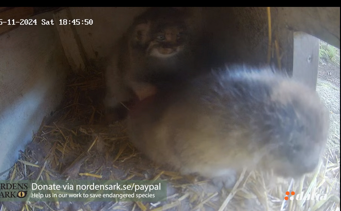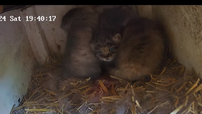Камера в ночном режиме, так как только что маманул закрывала весь свет. А сейчас вышла и котята потянулись за ней. Один практически вывалился из домика)))