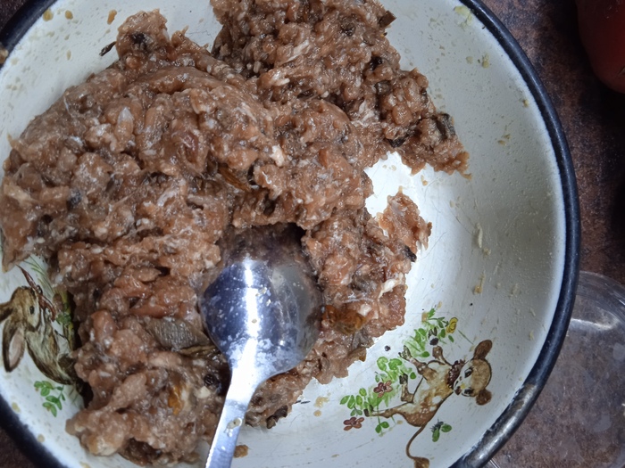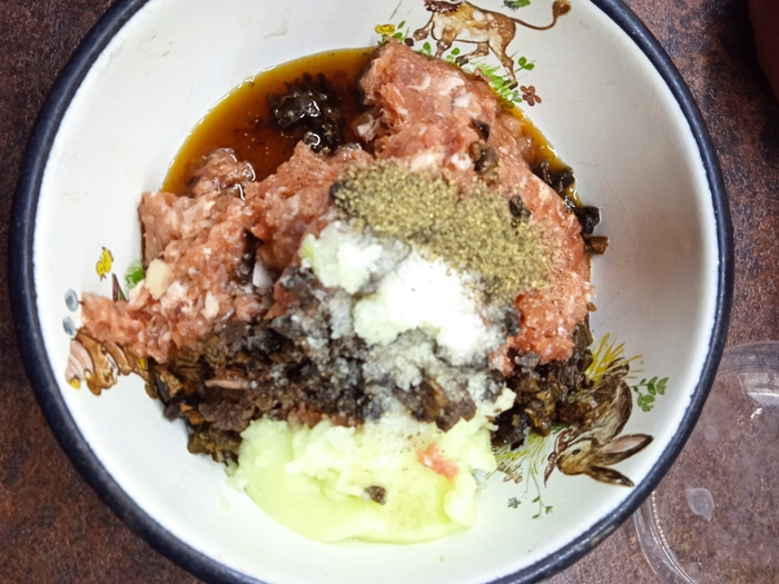 Вначале готовим начинку. Фарш смешиваем с отваренными и порубленными грибами, мелко порубленным луком (я измельчаю блендером), солью и перцем. Можно добавить немного грибного отвара для сочности.