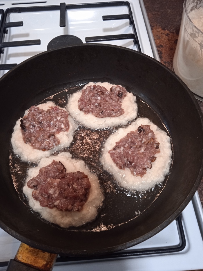 Сразу же, пока не запеклось, на каждый выкладываем лепешку фарша