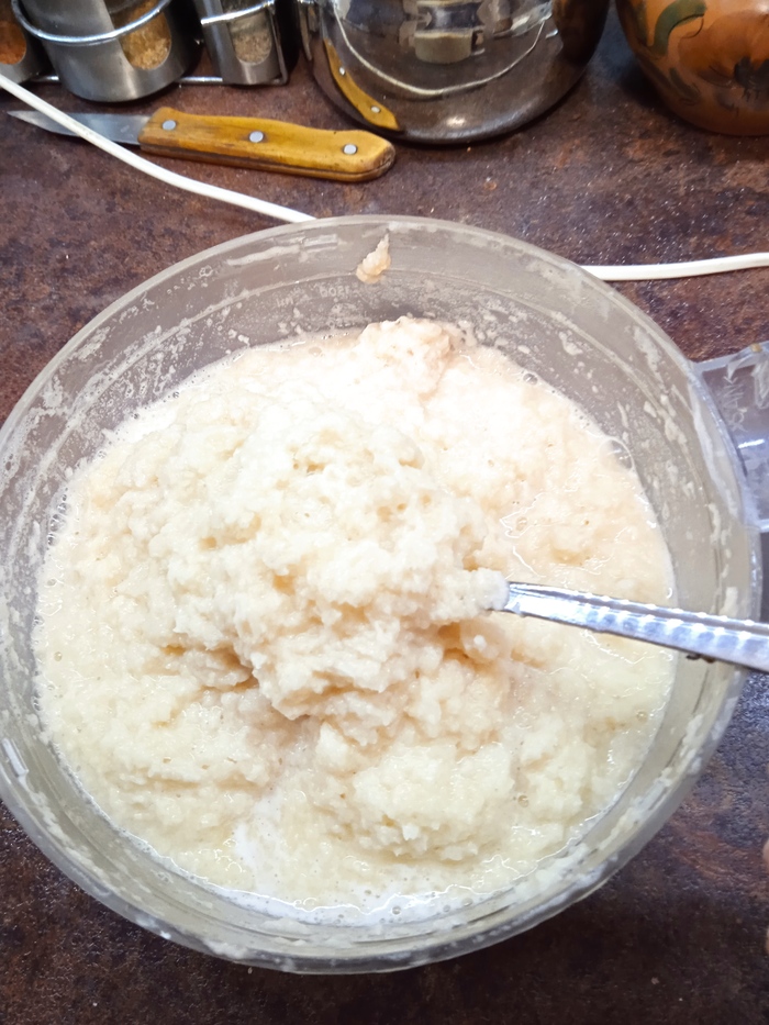 Картофельную массу солим, примерно 1/3 чайной ложки соли на 500 г картофеля или чуть меньше. Ни отцеживать, ни отжимать её не нужно! Картофельный сок содержит настолько много крахмала, что запекается на сковороде как блин, если его туда вылить.