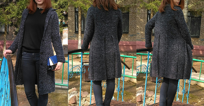 7. Пальто для дочки. Пряжа чёрная шерсть + серый мохер. Платочная вязка. Пальто получилось тёплое, но при этом очень лёгкое, всего 650 г. 3 недели заняла работа.