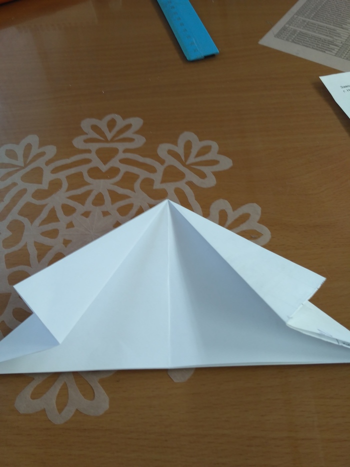 Разгибаем последнее сложение, и загибаем края к центру, максимально точно располагая сгиб от центра к краю.
