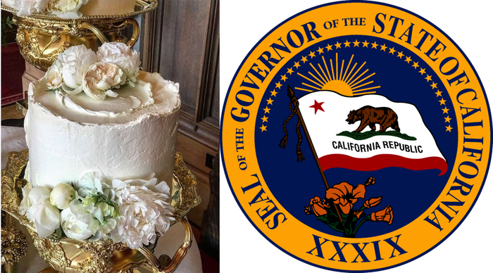 Слева торт со свадьбы Гарри и Меган, справа печать губернатора штата Калифорния, золотые маки внизу