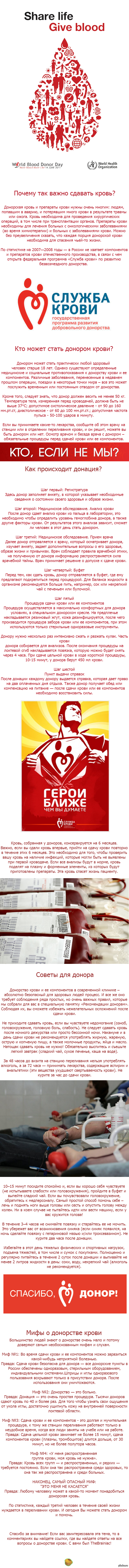 310 TheBrainiac Стань донором крови - спаси жизнь! Продолжение. 11 лет назад В этом длиннопосте я расскажу вам, почему важно сдавать кровь, кто может стать донором крови, а также о самых распространенных мифах вокруг донорства крови. Показать полностью 1 [моё] Наука Длиннопост Медицина Донорство Жизнь Здоровье Помощь