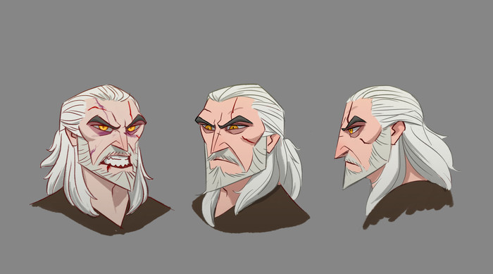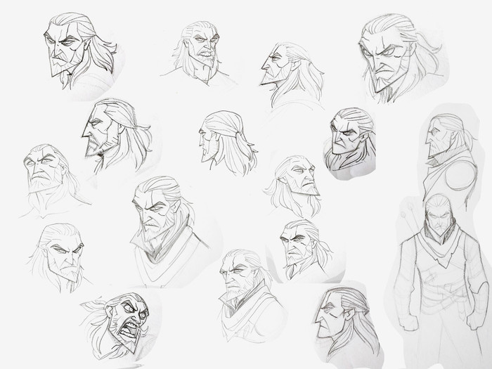 Some sketches I did when designing the stylized version of Geralt. These were the sketches that started to look more like him, I noticed slightly squinting his eyes made him look a lot more like Geralt from the gameПрим. Перевод: " Некоторые из скетчей, что я делала, разрабатывая стилизованную внешность Геральта. Эти зарисовки из тех, где Геральт уже похож на себя, я заметила, что если щурить ему глаза, внешность больше походит на игровую.