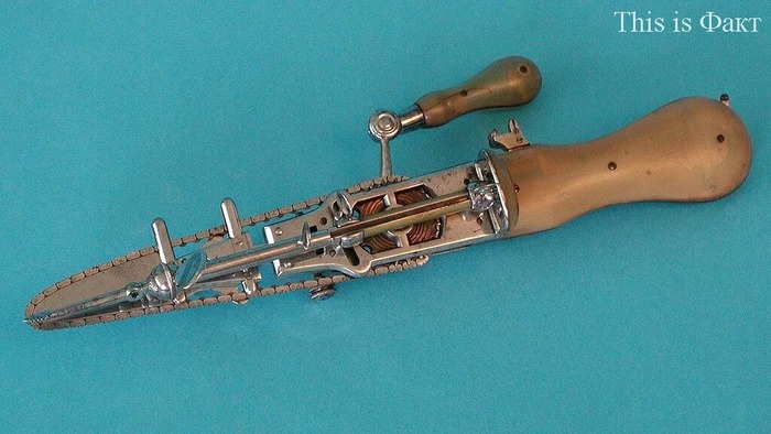 Первоначально процедура выполнялась вручную с использованием небольшого ножа и пилочки для удаления кости. Манипуляции делались без анестезии, посреди родов. Представляете, сколько времени женщине приходилось терпеть ужасную боль. Все это было долго, грязно и болезненно. Но, чтобы сделать удаление тазовой кости более легким и менее трудоемким процессом, в 1780 году два врача изобрели подобие бензопилы.