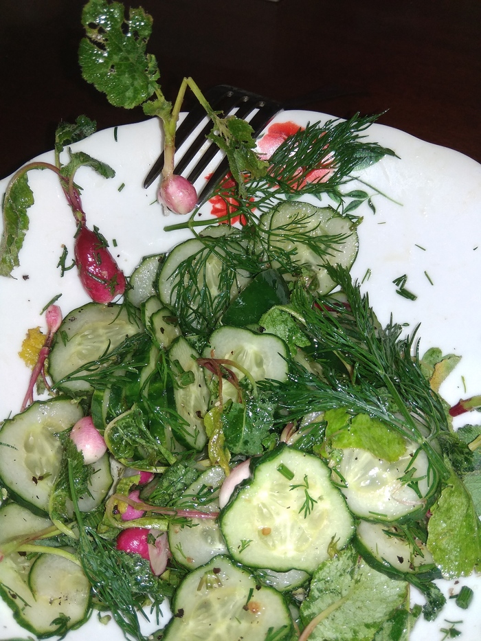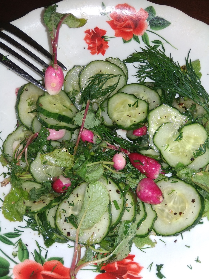 Взял я этот урожай, домой привез, помыл, а сегодня соорудил вот такой салат. Огурчик, мини редиска с ботвой, укропчик, чуть-чуть соли и растительного масла. Черный перчик и кориандр - это святое! Получилось волшебно. И, на мой взгляд красиво. Витамины шевелились в тарелке и норовили уползти. Но им это не удалось.