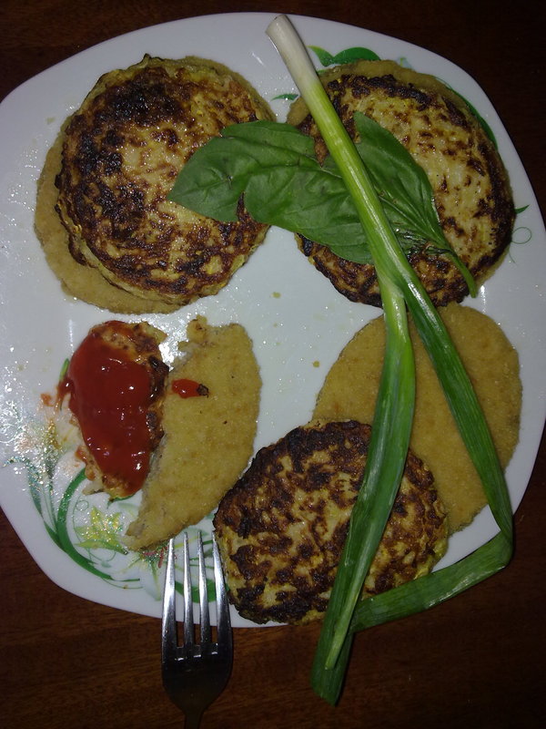 Все ингредиенты, кроме яиц и муки, были безжалостно истерты на терке, а затем смешаны. Получилась довольно густая масса, которая выкладывалась на горячую сковороду с растительным маслом и обжаривалась с двух сторон. Время жарки зависит от огня. Я жарил на индукционной плите на мощности 800 каждую строну по 2-3 минуты. Вообще есть мною обнаруженное правило, - когда жаришь, нельзя спускать глаз со сковороды. То, что кажется недожаренным сейчас, через 20 секунд, а то и раньше, превратится в уголь.
