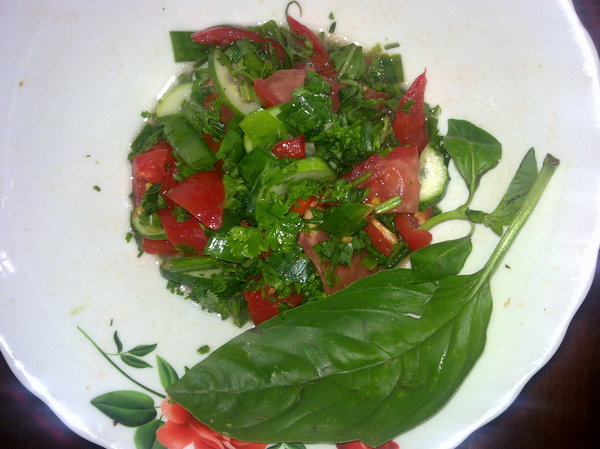 Осталось собрать блюдо. На рыбную котлету кладем кабачковую. Поливаем и посыпаем всем, кому что любо. Едим с салатом из огурцов, помидоров, базилика, зеленого лука, укропа, петрушки и всех мыслимых и немыслимых приправ и ингредиентов. Тут на вкус и цвет товарища нет. Мне нравится. Кому нет - готовьте фаршированного верблюда или суп из ласточкиных гнезд.