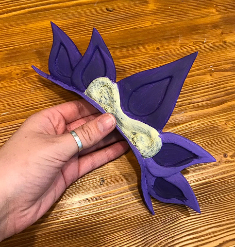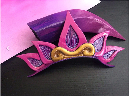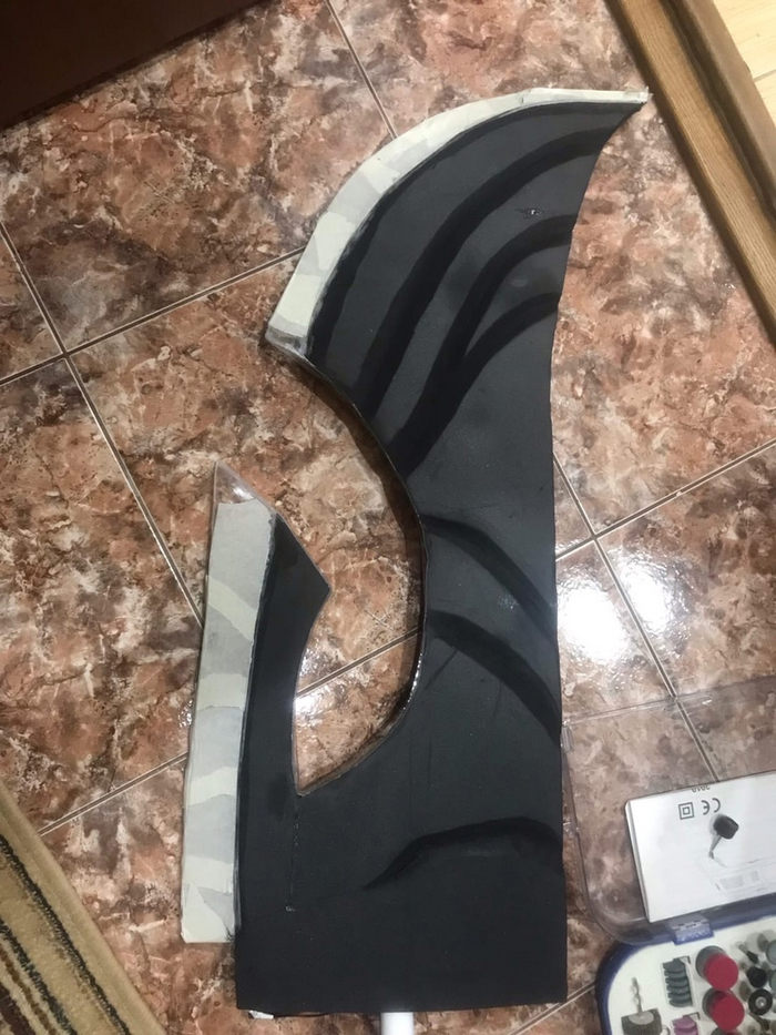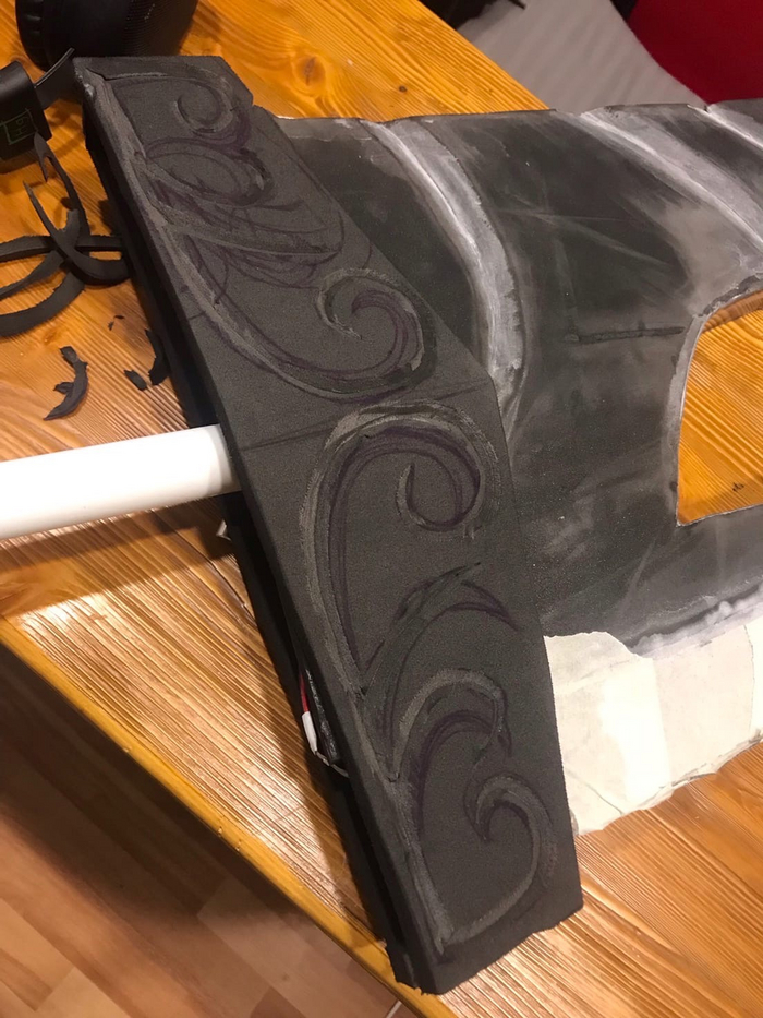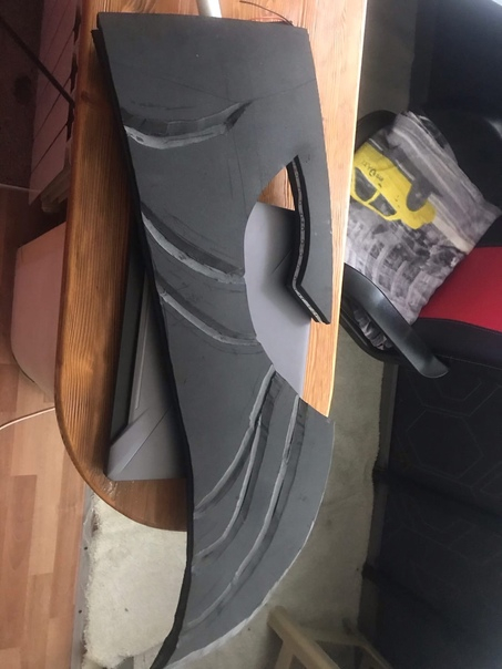 Объемную часть гарды сначала сделала из пеноплекса, но мне она показалась слишком тяжелой и было принято решение пересобрать ее из евы. Так она получилась упругая, твердая и очень легкая, ведь была полой внутри. На нее сверху нанесла тонкие узоры.