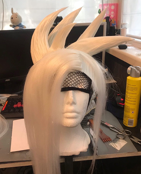Все началось с того, что я начала попробовать сшить два парика и перешить их в правильное направление. Честно проведя за этим делом часа дак 4, я поняла что это слишком сложно и с волосами мне работать уж очень тяжело. Наташа предложила сделать каркас. А я немного не так трактовала ее предложение и врубила своего безумного крафтера и СКРАФТИЛА ПАРИК ИЗ ЕВЫ. Еву покрасила в белый и просто приклеивала к ней волосы по направлению укладки.