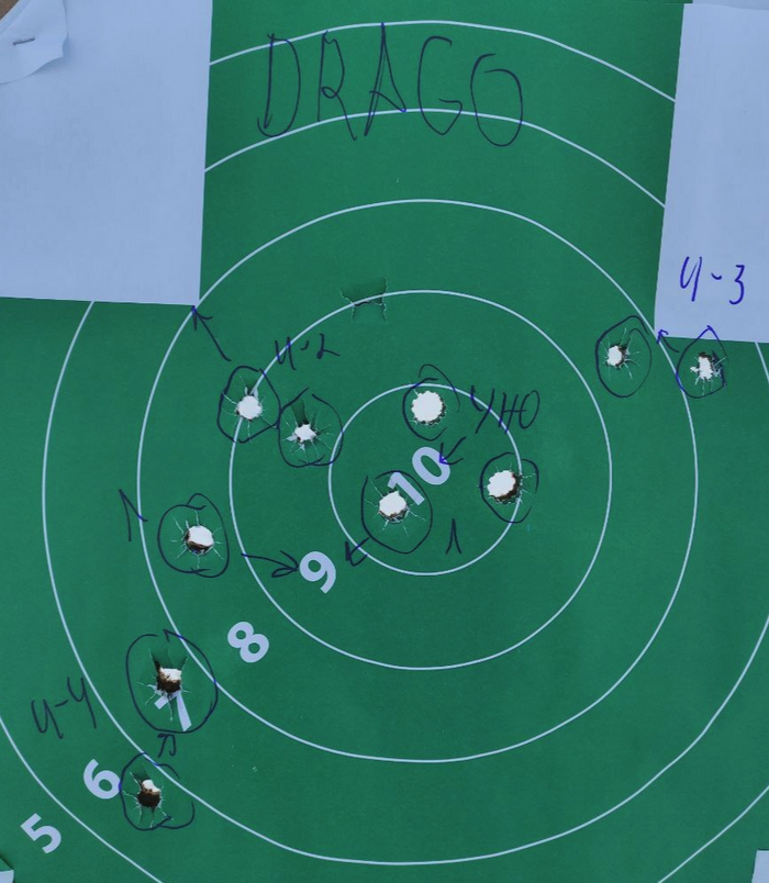 Выстрелы 1 и 2 отмеченные на мишени - пристрелка. Получилась неплохая кучка, как для гладкого. Не обошлось и без срывов, но не критично, руку набить и будет лучше.