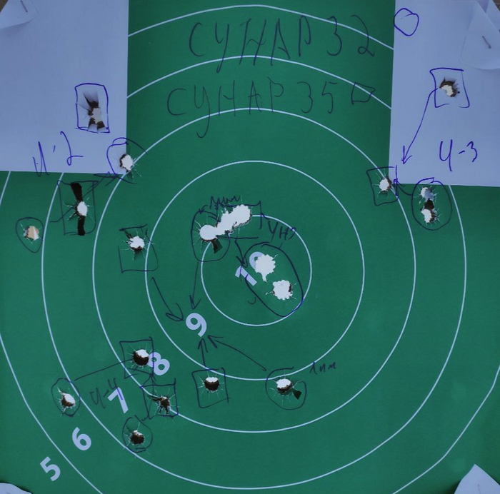 Сунары, 32 и 35 по 2 патрона каждого. Масса пороха 1,45 и 1,4 соответственно. На фотке попадания круг - С32, квадрат - С35