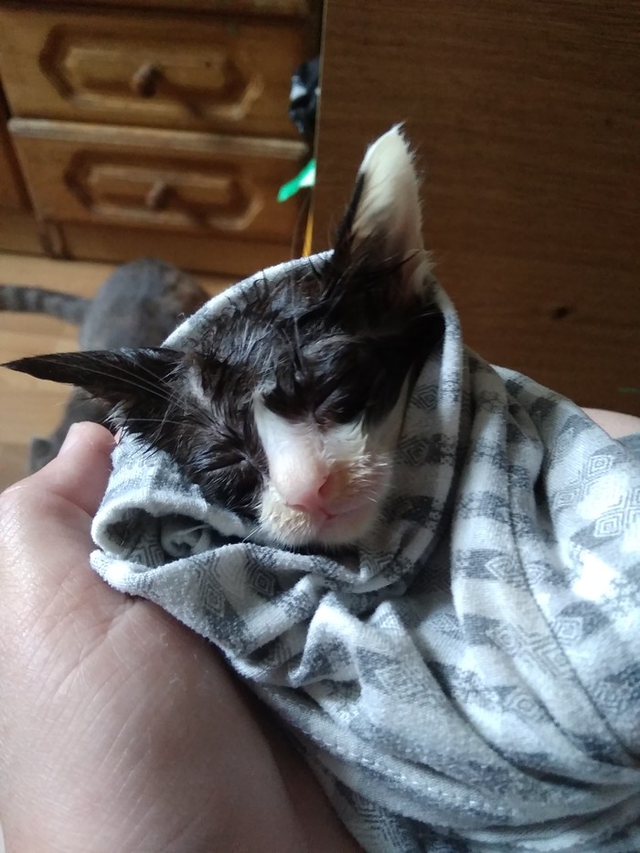 Как-то я увидела в инстаграмме просьбу помочь поймать котят и маму кошку, которая родила под забором в канаве около дороги. И она и котята выбегали на дорогу и могли погибнуть под колёсами. Да ещё и хозяин забора постоянно гонял котят, ему не нравилось, что они забегают к нему во двор.