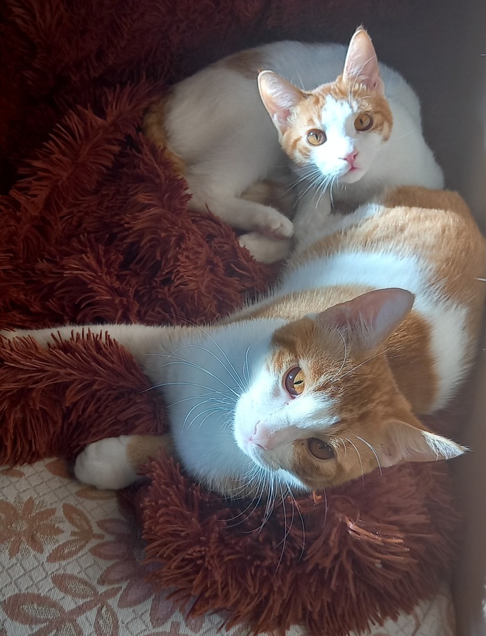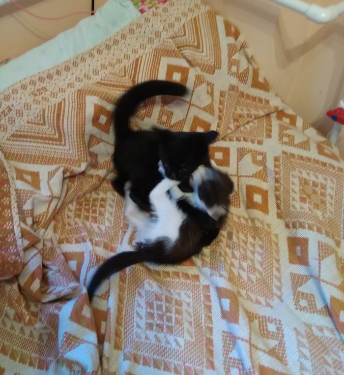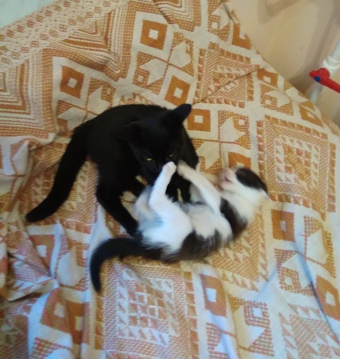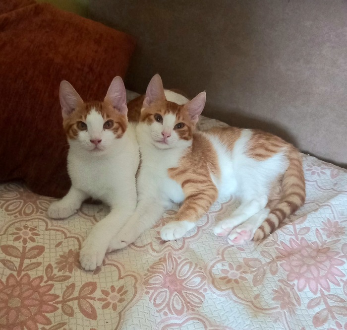 А этих котанов и ещё двух их братьев мне привезла подруга. Её родственница устроила из квартиры притон, и там ещё и окотилась кошка. Котят надо было забирать, так как ситуация для них была опасная. Так в возрасте трех недель они приехали к нам. Кормить пришлось со шприца, потом, почему-то с большим трудом, приучила их кушать самих. Двоих удалось пристроить ещё маленькими, а эти засиделись, а когда нашлись хозяева и для них, друг без друга братаны уже не могли, орали, не давая спать никому, и переставали есть. Так нам их и вернули, а брать сразу двоих никто не захотел. Так эти два бандита остались с нами.