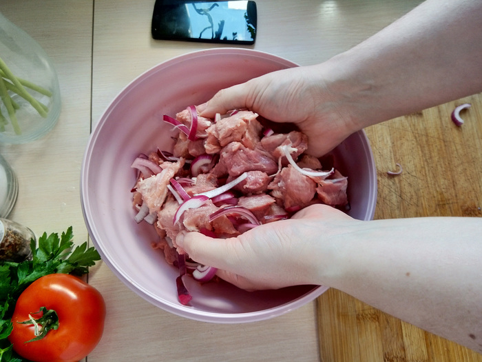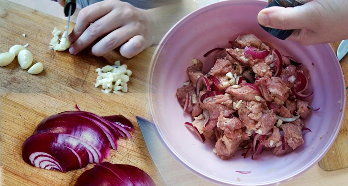 1. Мясо (желательно свиная шея, т.к. она оптимально подходит по жирности) - 1 кг;