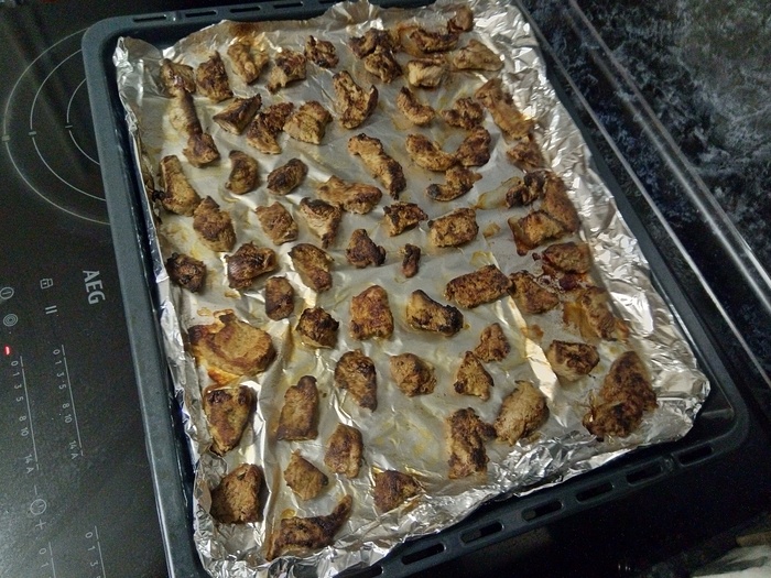 После достаем мясо из маринада и тщательно отчищаем, т.к. нам совершенно не нужны подгорающие кусочки овощей на сковородке.