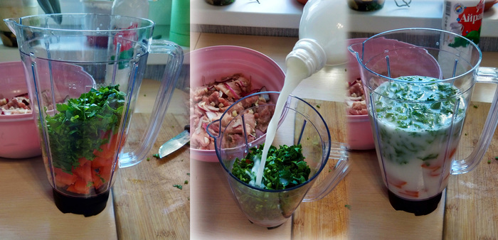 Помидор и петрушку нарезаем крупно, потом в блендер и добавляем наш кисломолочный продукт.