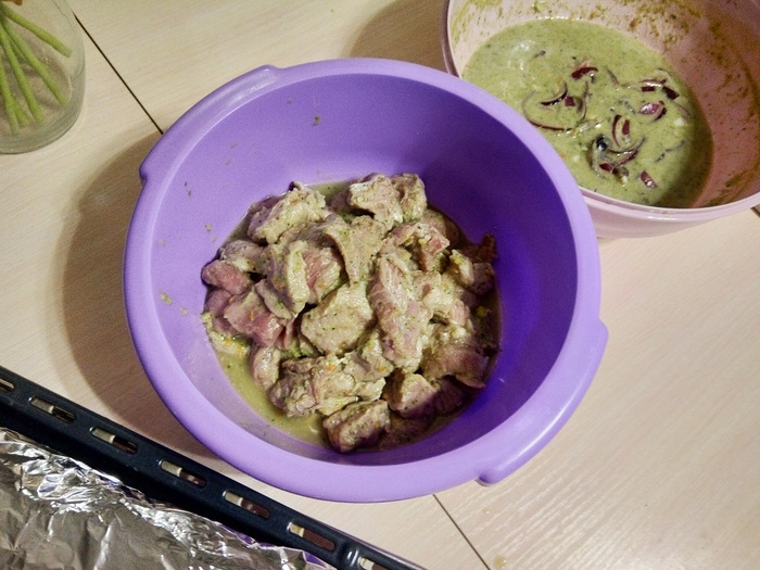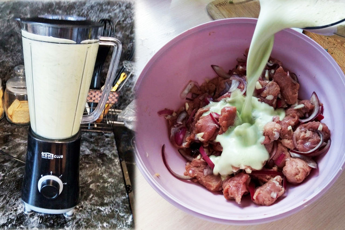Измельчаем до однородного состояния и заливаем этой смесью наше мясо. На этом этапе вспоминаем добавить кориандр (1-2 щепотки!).
