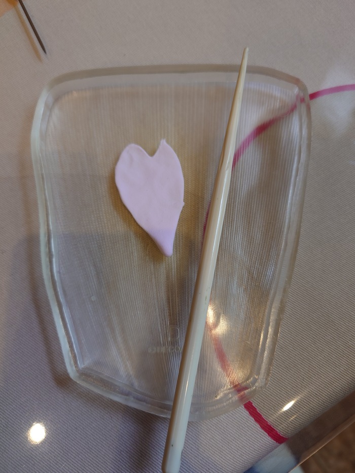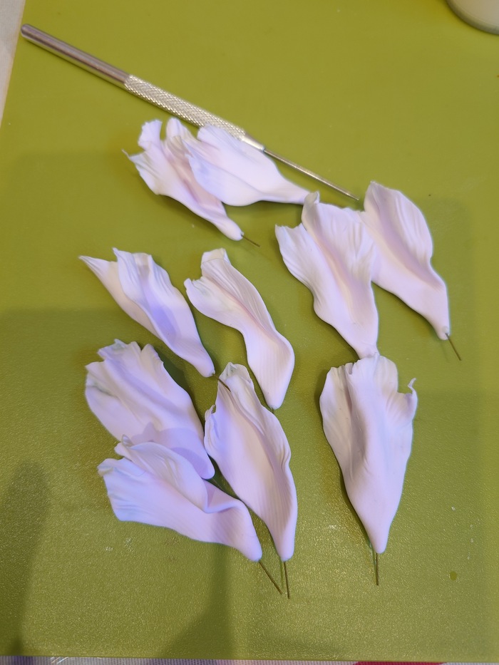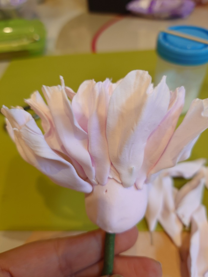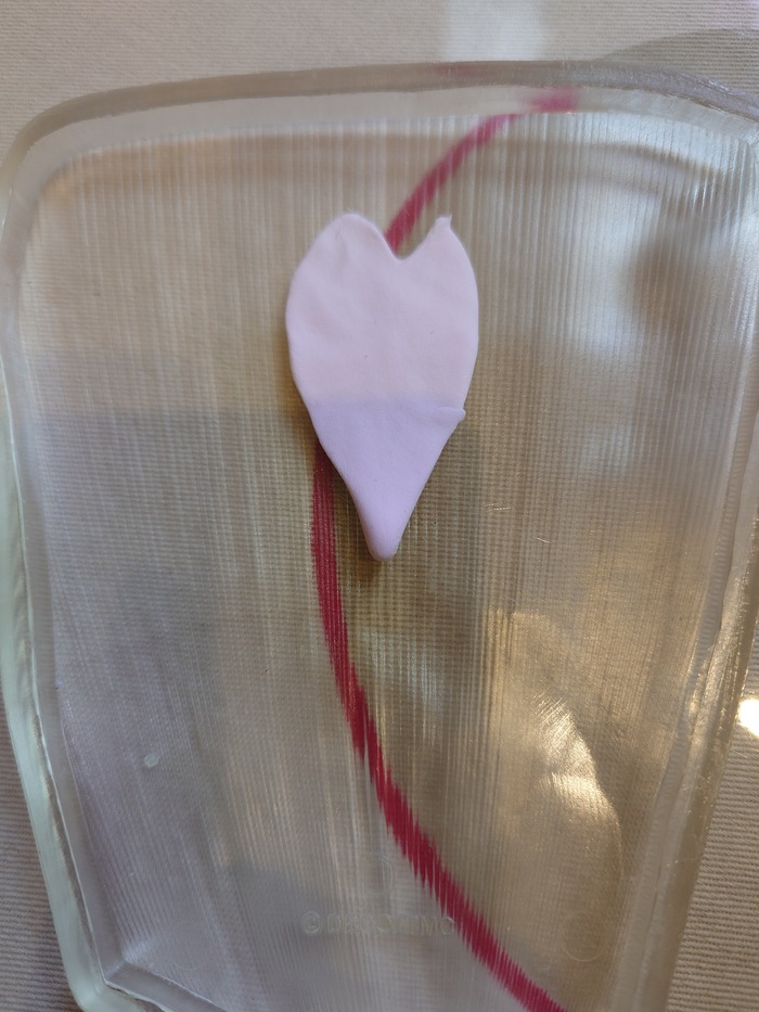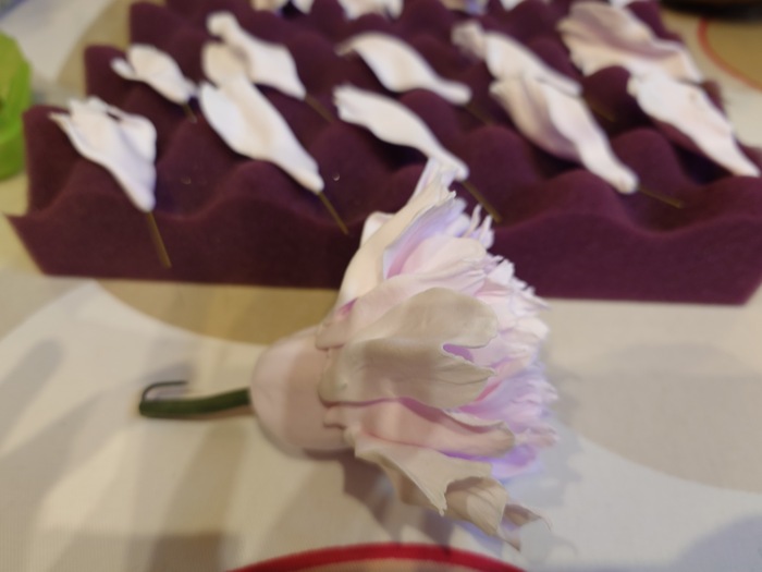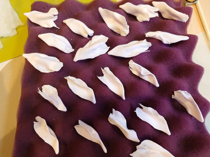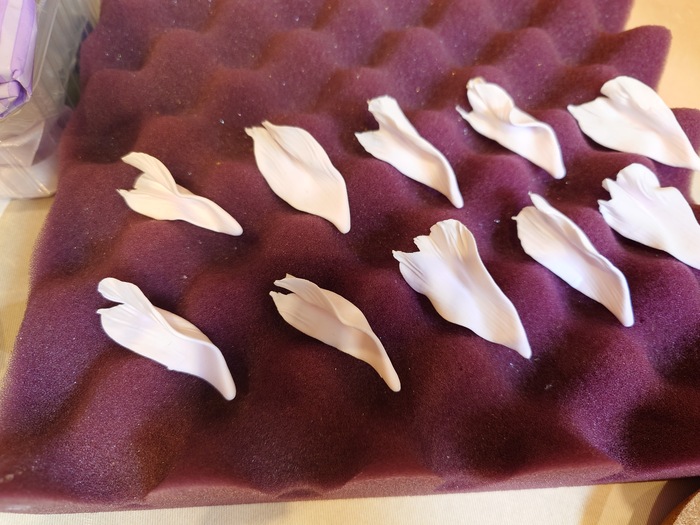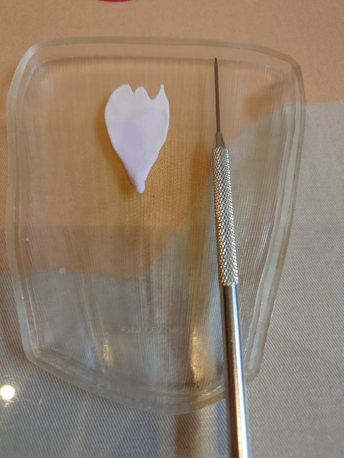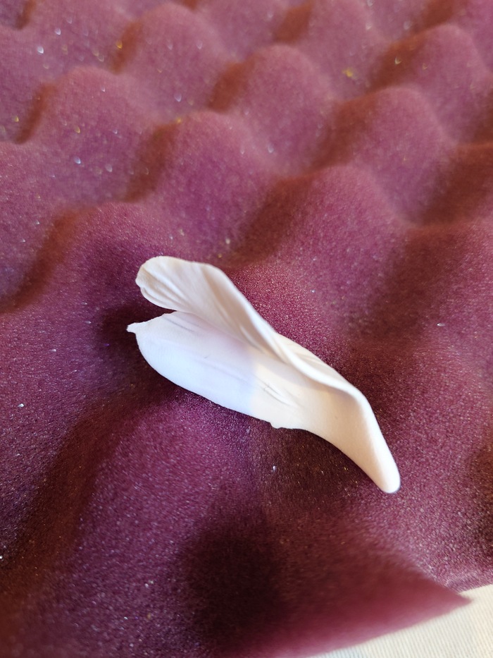 Получилось примерно так, как на фото. Теперь нужно высушить лепесток на специальной сушке, сушится примерно минут 40, если нет повышенной влажности. Обратите внимание: края лепестка тонкие, почти просвечивают, а "хвост" толстенький, так нужно, чтобы лепесток держал форму.