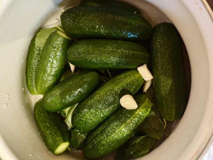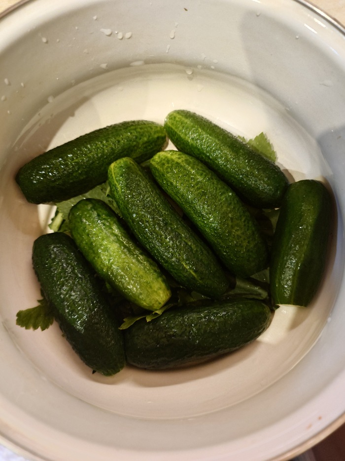 Берем огурцы, замачиваем в холодной воде. Кто-то замачивает на час, я максимум минут на 10-20, просто чтобы проще отошла грязь всякая: песочек, травинки.