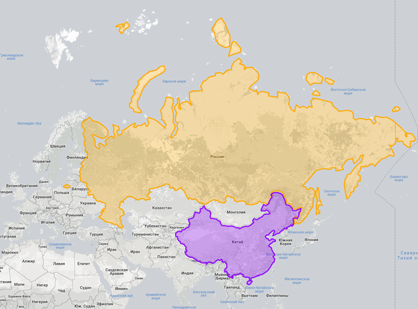 Для примера, если мы думаем о Росии и Китае, во сколько раз Россия больше чем Китай? 7? 10?