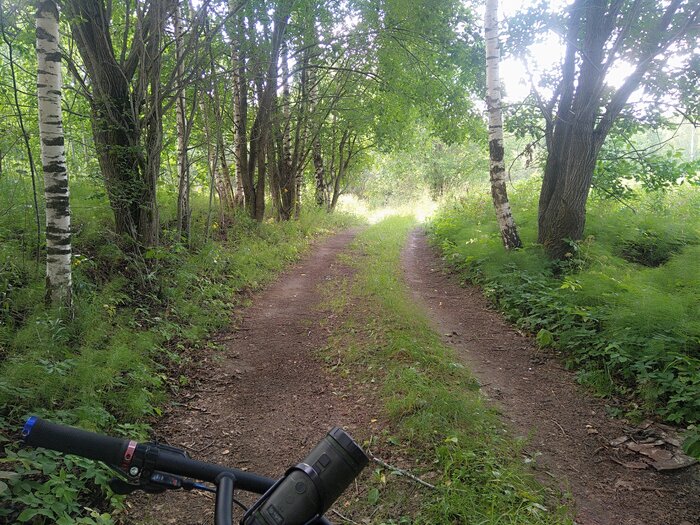 А когда дорога упирается в ворота в/ч., значит время сворачивать. Налево уходит отличная дорожка накатаная квадриками. Едешь по ней, как по зелёному туннелю.