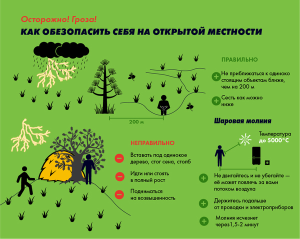 Перед поездкой на природу уточните прогноз погоды. Если предсказывается гроза, то перенесите поездку на другой день. Если Вы заметили грозовой фронт, то в первую очередь определите примерное расстояние до него по времени задержки первого раската грома, первой вспышки молнии, а также оцените, приближается или удаляется фронт. Поскольку скорость света огромна (300 000 км/с), то вспышку молнии мы наблюдаем мгновенно. Следовательно, задержка звука будет определяться расстоянием и его скоростью (около 340 м/с).