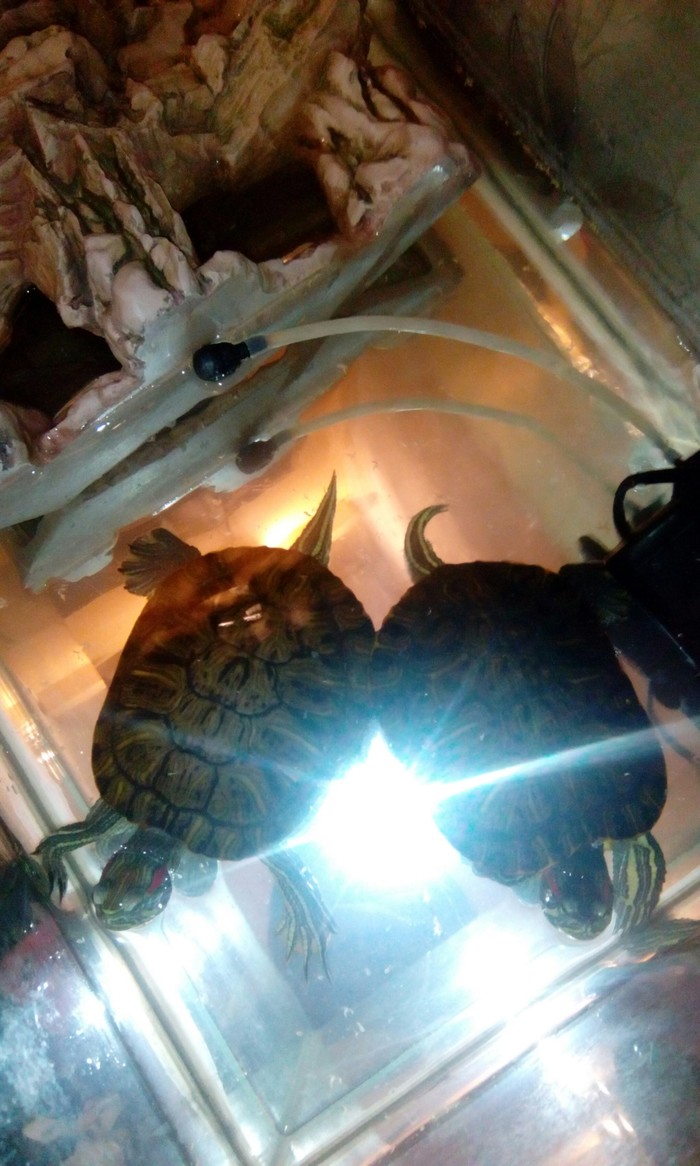 Это мои черепашки, их зовут Лупа и Пупа. Обожают курицу и кусаться за палец)))