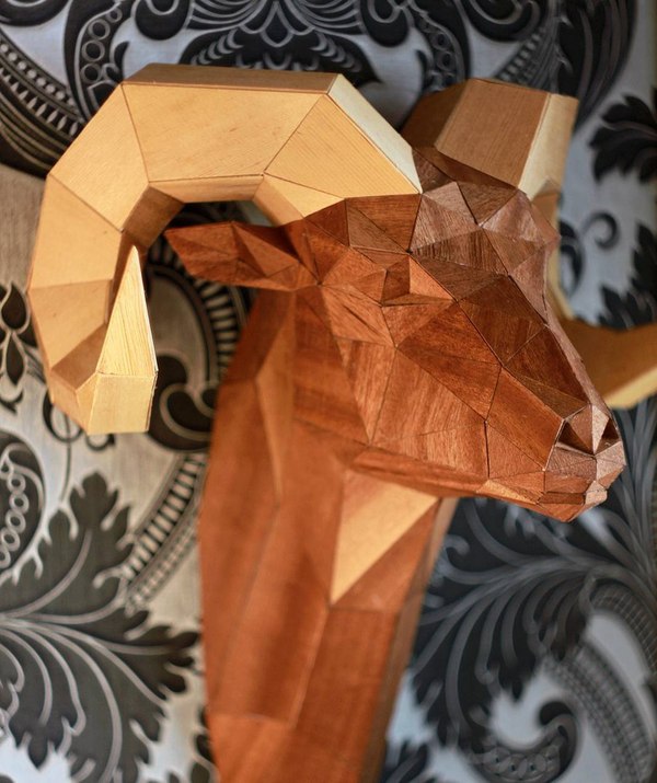 Чаще всего их вырезают и склеивают из картона, все-таки быстро, удобно и недорого. Я не стала исключением, но неспокойная душа просила каких-то рукодельных извращений, и тут-то мне на глаза попались обрезки деревянного шпона, оставшиеся после учебы в университете (художественно-графический факультет и его личные сорта издевательств над студентами, да :D). В общем, представляю на ваш суд результат месяца кропотливой работы, орудования канцелярским ножом, небольших психов из-за сложностей работы с материалом - "Деревянный" баран Саша)) Почему Саша? Надо спросить у автора модели, она так и называлась)