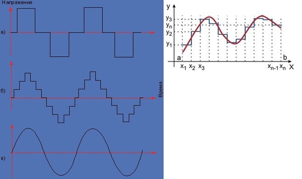 Это означает: что звуковая волна с бесконечным множеством существования тех самых столбиков пропускает их записывая всего :((( сорок одну тысячу сто штук в секунду. Разница таких импульсов и их прямое влияние на звучание изображено на графиках ниже. 41.100 блоков информации в секундочку.