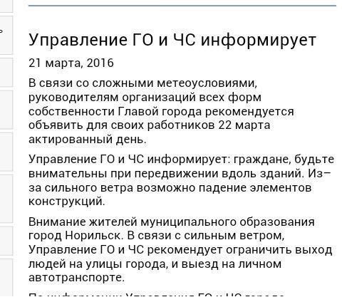 Ув. Педагоги!!!! Распоряжение управления ЧС и Главы г. Норильска завтра объявляется АКТИРОВКА ДЛЯ ВСЕХ КАТЕГОРИЙ РАБОТНИКОВ БОЛЬШОГО НОРИЛЬСКА!!!!! Обзвонить всех детей с предупреждением о категорическом запрете выхода на улицу! Завтра никаких занятий!!!!