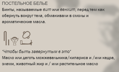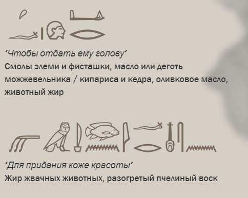 Строение некрополя и мастерской лучше представлено на самом сайте в статье, интереснее другое: рецепты, который должно были сохранить тело для будущей жизни. Составляющие свозились в Египет со всех уголков Древнего Мира. По сути, в процесс мумификации были косвенно вовлечены сотни, если не тысячи людей, с разных уголков света.