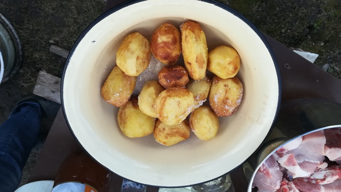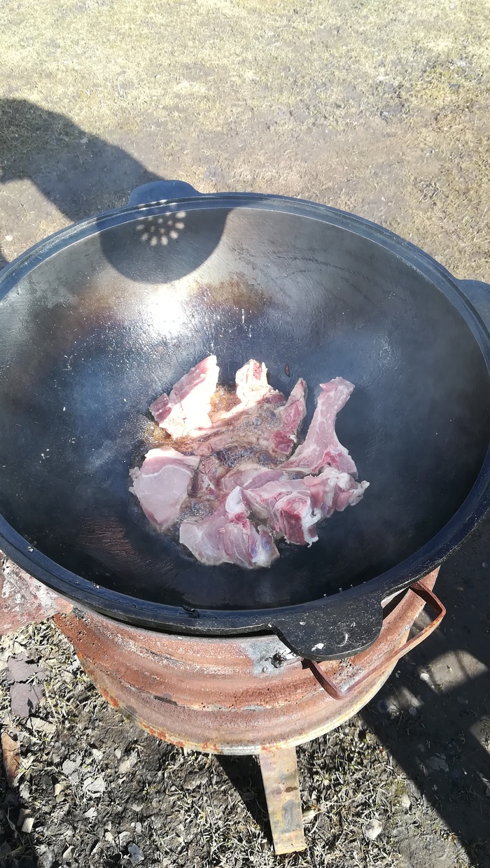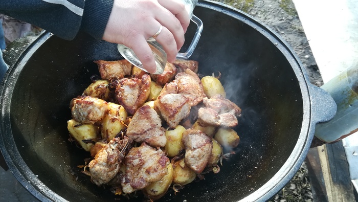 Снизу картошка, сверху мясо. Добавляем немного воды. Убираем огонь из-под казана и тушим минут 40.