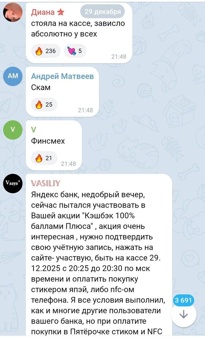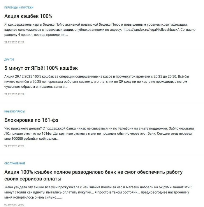 Россияне возненавидели Яндекс. Компания объявила об акции с кэшбеком 100%, для получения которого нужно было 29 декабря с 20:25 до 20:30 оплатить покупку их картой. Когда в магазинах собрались толпы, всё зависло: приложение перестало работать, у людей списывались деньги, но никакого кэшбека они не получили. Сам Яндекс в ответ просто попросил прощения