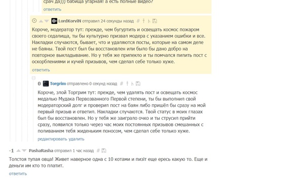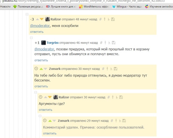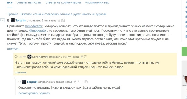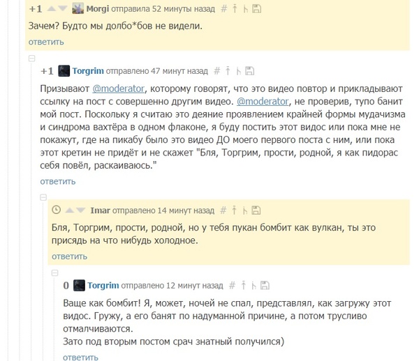 Всё началось с того, что я загрузил видосик, вот тутоньки: http://pikabu.ru/story/trening_tyazhelee_chlena_i_povaryoshk.... Какой-то альтернативно развитый перец сказал, что это повтор и приложил ссылку на пост, в котором было совершенно другое видео. Мой пост удалили. Не, я не против если пост отхватывает груду минусов, это справедливо. Но когда его выкидывают голым на мороз без причины - это перебор, я был оскорблён и попытался призвать модератора: