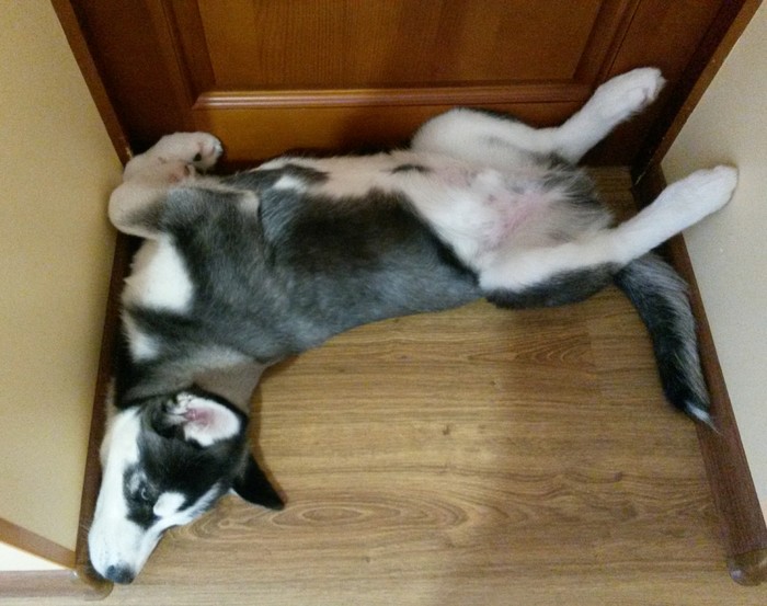 Охраняет дверь, вход и выход платный -одна собачья печенька.