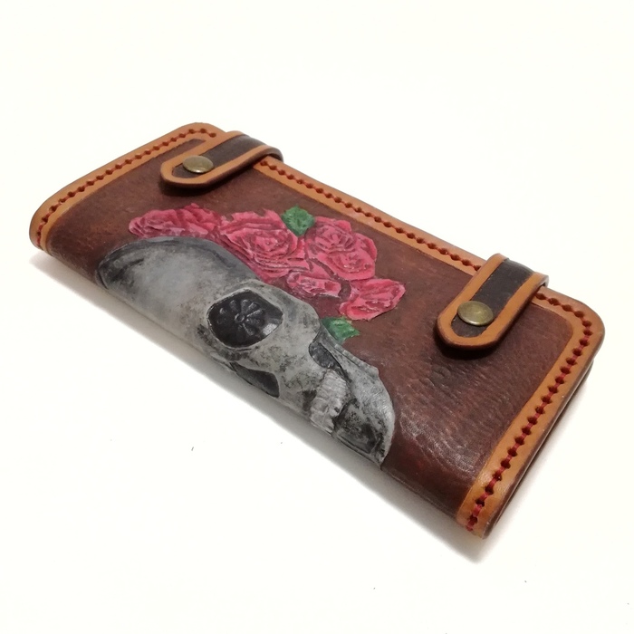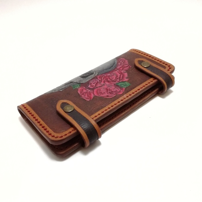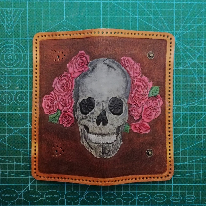Рисовать на коже акрилом или выжигать рисунок мне не понравилось, поэтому я стала учиться тиснению. Дошла до уровня, который сочла приемлемым для попытки создания картинки из головы, и приступила.