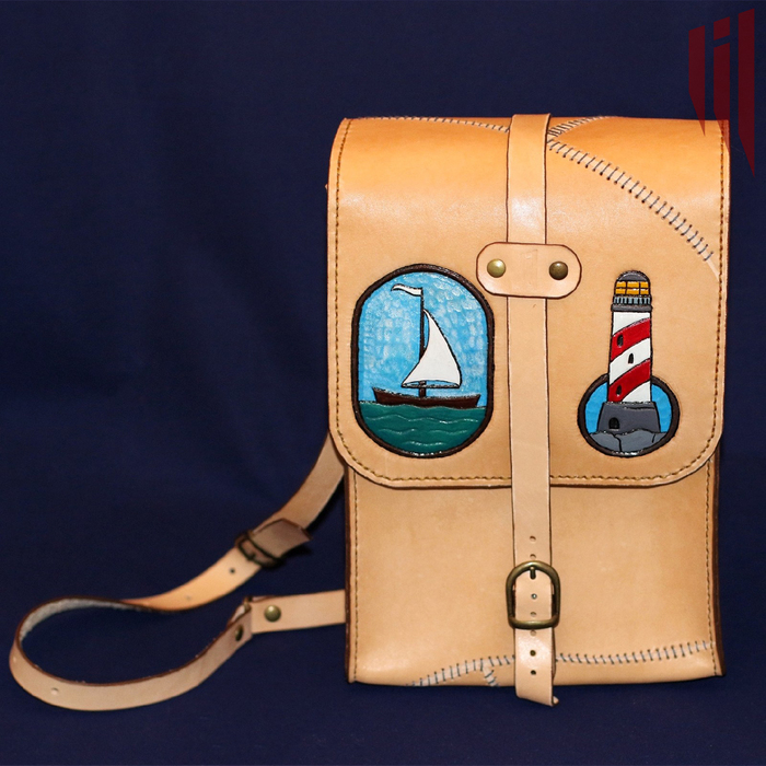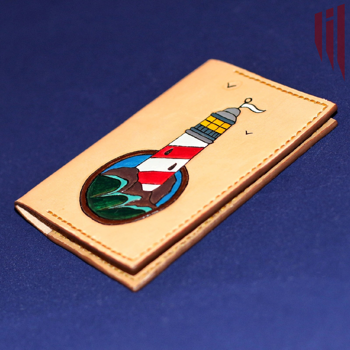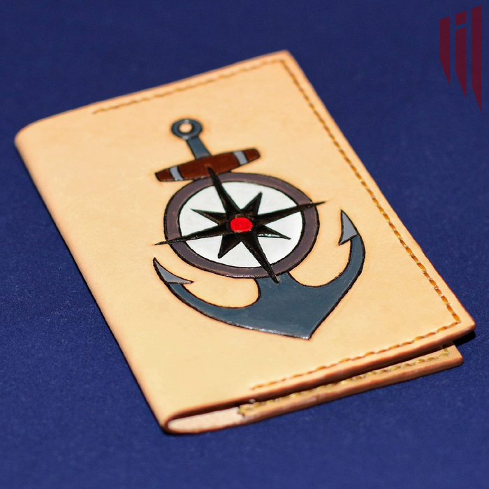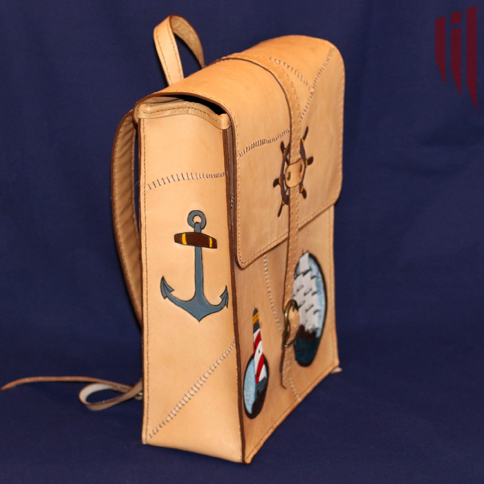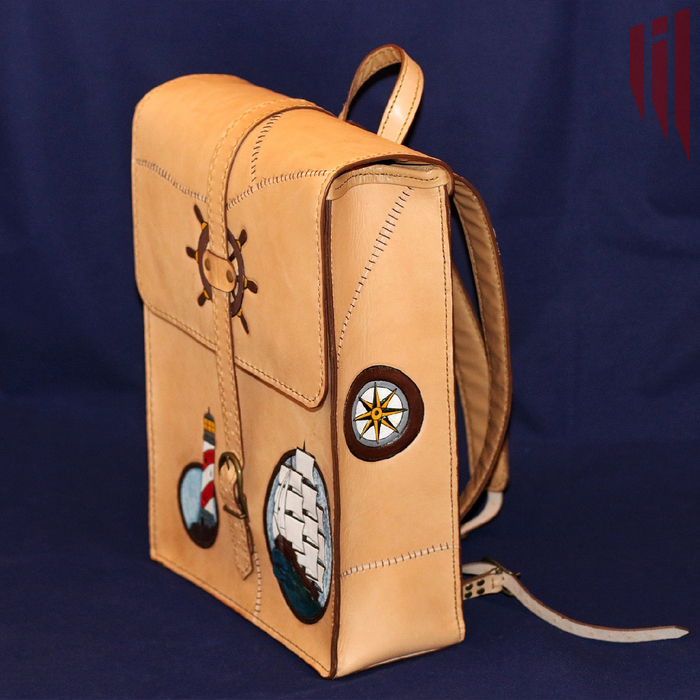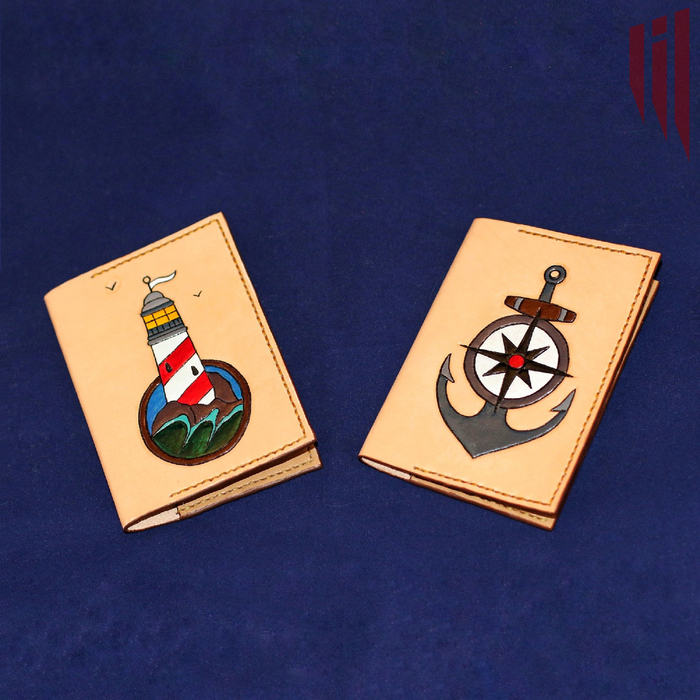 Всего вышло 5 изделий: длинный кошелек, пара обложек для паспортов, сумка-планшетка и рюкзак. Все изделия выполнены из кожи растительного дубления толщиной 2-2,5 мм. Рисунки на них аналогичны, но не повторяются. Идея: море, возвращение домой.