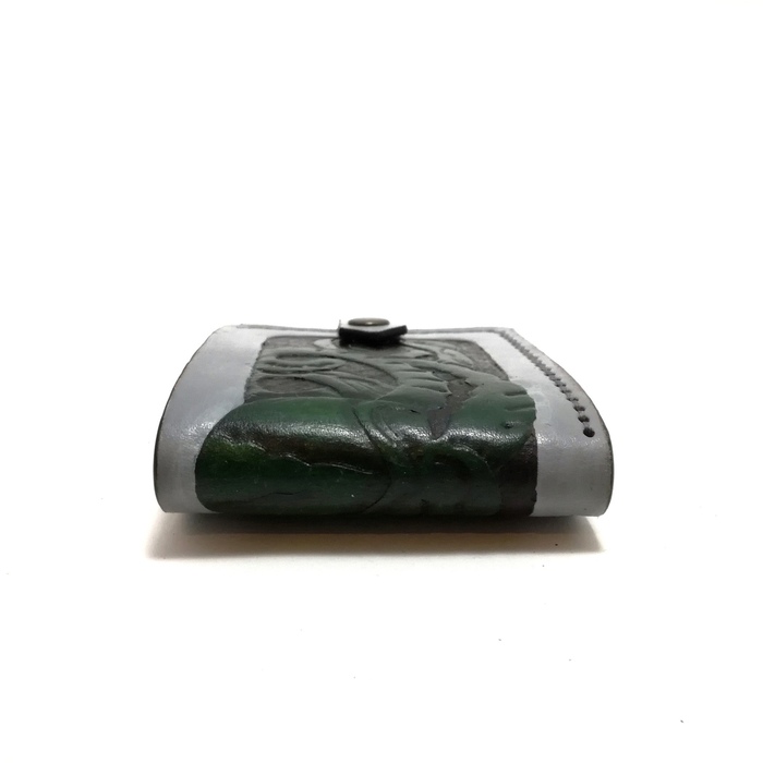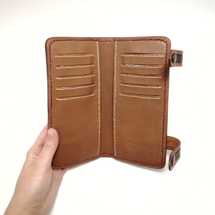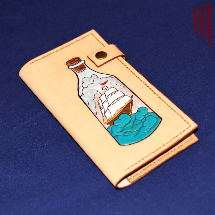 Кошелек сделан по той же схеме, что и обложки, разве что рисунок немного выбивается из общего стиля. Не смогла удержаться, потому что корабли в бутылках напоминают мне не только часть сюжета Пиратов Карибского моря, но и сказки Владислава Крапивина. Кошелек закрывается на кнопку. Вся фурнитура в коллекции — латунь.