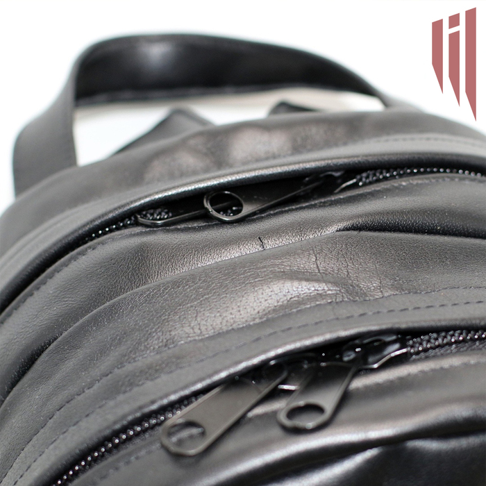 До сшивания деталей делала им "шрамирование" (хотела сделать такую несерьезную имитацию разных кусков кожи, сшитых между собой). Сквозь тонкий подклад просвечивают швы, которыми скреплены "шрамы". Чтобы их скрыть, на обратной стороне крышки (как у планшетки, так и у рюкзака) подклеен флис и закрыт все той же тонкой кожей.