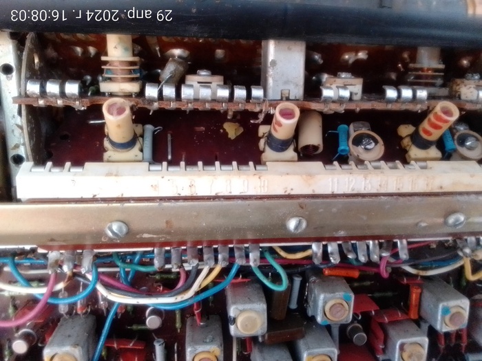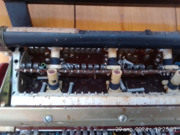 Контакты селектора покрасивели. Контакты на неподвижной гребёнке, естественно тоже почистил. Деревянную рамку изнутри шлифанул, склеил и зафиксировал на ночь парой ремней и грузом.