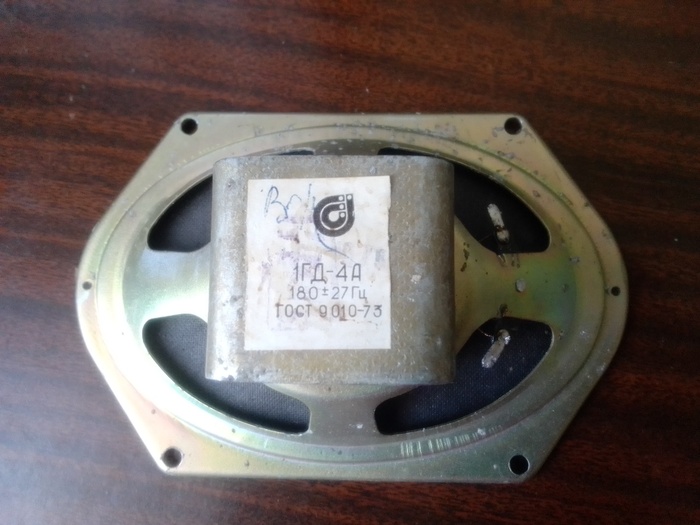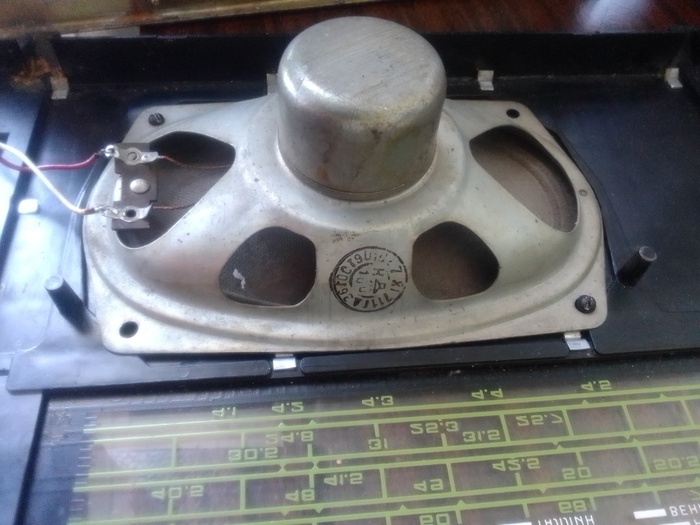 В первой части говорил, что динамик в этом приёмнике не очень. Нашёл ему на замену 1ГД-36. Хоть и не 3ГДШ-1-8 с его аж 12500 Гц верхней границы, но тут и 10000 Гц сойдёт. Снимаем штатный 1ГД-4А. Обратите внимание на его (я так понял) нижнюю границу частот: