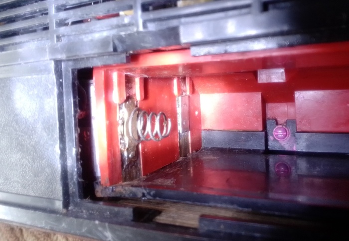 Думал, будет хуже. Динамик не гнилой и даже не рваный. Модель динамика 1ГД-4А, восьмиомник. Диапазон частот у него не очень, встречаются рекомендации менять его на 3ГДШ-1-8. Поищу, подумаю... Местами пятаки ржавчины на железном каркасе ("шасси") приёмника, внутри пыльновато и чуток паутины. Похоже, хранился где-то в гараже. Контакты в батарейном отсеке ржавые, вокруг них следы ржавчины. Видать, когда-то "потекли" батарейки. Имеется даже поворотно-наклонный механизм антенны! Не у всех он дожил в целости до 21 века. Самой антенны, правда, нет. Спасибо ещё переменные конденсаторы (КПЕ) не замыкают, без отвала пластин и не погнуты в хлам. Контакты селектора диапазонов, естественно, окисленные.