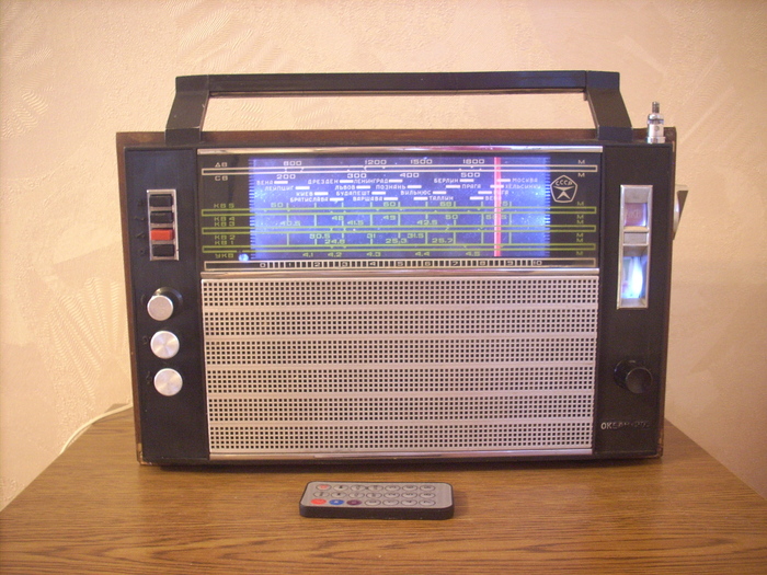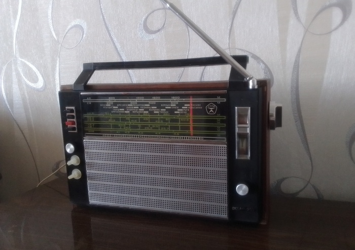 Ручки тембра ВЧ и НЧ подходящие по дизайну не нашёл, поэтому пока такие. По алюминиевой сетке динамика немного прошёл шлифовальной губкой. Выглядит приёмник вполне прилично. Антенну временно позаимствовал с другого "Океана", там всё равно подключена внешняя.
