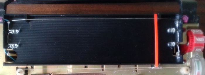 Барабан указателя текущего диапазона (вот этот красный) довольно непрозрачный, подсветить его так, чтоб не удлинять выводы светодиода, сложно (светодиод придётся практически просунуть внутрь этого барабана), а нормально закрепить его близко к барабану как-то негде. А если удлинять выводы - при встряске могут погнуться, и свет уйдёт. Но указатель диапазона, как выяснилось, более-менее освещается и так.